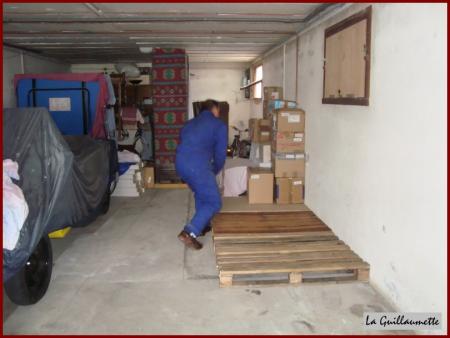Roger a installé des palettes pour éviter de poser les cartons à même le ciment. C'est une précaution pour éviter les remontées d'humidité.
