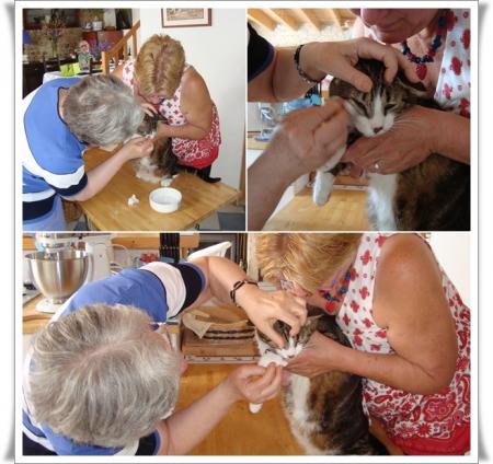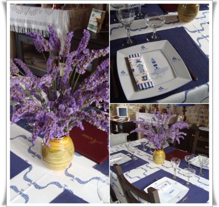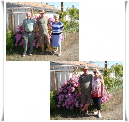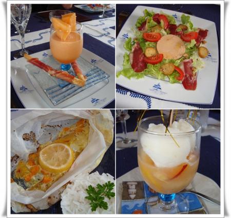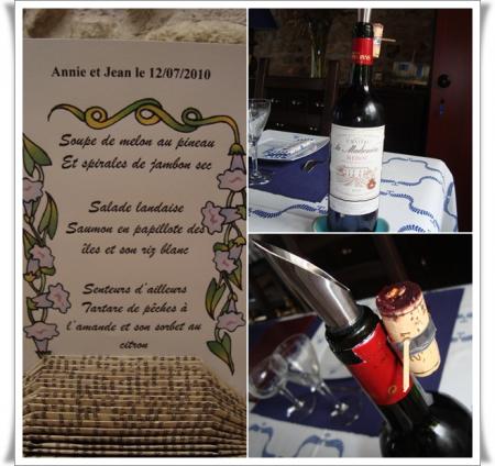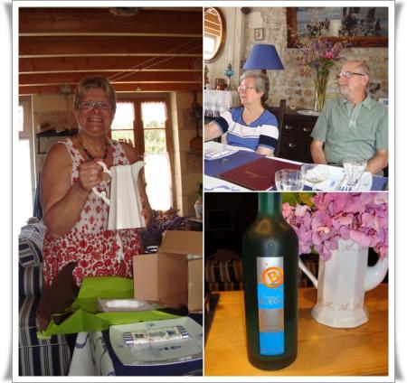 | Cela faisait bien longtemps que nous n'avions eu le plaisir de recevoir Annie et Jean, nos amis de Cognac.  Le rendez-vous était enfin pris et lundi, il venait passer la journée avec nous. A peine arrivés, Annie joue "à la vétérinaire"...... Elle a depuis de nombreuses années des minous et a une bien plus grande expérience que moi dans ce domaine. C'est ce matin-là que Pirate avait mal à l'oeil. Nous essayons de lui nettoyer car son oeil coulait.....   J'avais préparé une belle table en bleu pour les accueillir.   Nos hôtes nous ont gâtés. Roger a reçu une bouteille de liqueur de cognac Brisset "Orange bleue".  L’Orange Bleue est élaborée à partir de cognac, de jus naturels d’agrumes (pamplemousse majoritaire) et d’un curaçao fait avec le cognac de la propriété. Ce cocktail titre 16° et se consomme frappé ou sur glace pilée ou sur glaçons. Il êut être également allongé de champagne, d’un crémant sec ou d’eau pétillante. En effectuant quelques recherches sur le net, j'ai appris que ce cocktail pouvait être utilisé en cuisine pour réaliser, par exemple, des Saint-Jacques à l'Orange Bleue. Quant à moi, nos amis m'ont offert une magnifique cruche. J'aime beaucoup la forme qui est originale et lui donne un petit air ancien. Encore merci à vous deux de nous avoir tant gâtés.   Passons au menu à présent. Après le champagne en apéritif : - une soupe de melon au pineau et spirales de jambon sec - une salade landaise - du saumon des îles en papilotte et son riz blanc - comme dessert, un tartare de pêches à l'amande et son sorbet au citron. Pour consulter les recettes, cliquez sur les liens.   Comme d'habitude, mon "oenologue préféré" nous a gâtés avec d'excellents vins de sa cave à vin.   En fin d'après-midi, Roger nous a emmenés visiter son jardin, l'endroit idéal pour prendre des photos "souvenir"..... Superbe journée et quel plaisir de retrouver Annie et Jean. A bientôt......