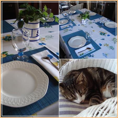 La table est dressée. Nous attendons l'arrivée de nos amies. Même Pirate est là sur son fauteuil (qui était le mien et qu'il a accaparé....) pour les accueillir.