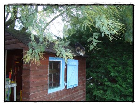Après le bricolage intérieur, on passe à l'extérieur.... et au rangement du chalet. Roger a installé des étagères pour pouvoir ranger tous ses produits pour le jardin.