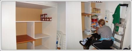 L'ancienne propriétaire nous avait laissé une armoire et Roger a réorganisé l'intérieur en fonction de nos besoins. Un côté penderie pour ranger les vestes et tabliers pour aller au jardin ou bricoler et l'autre côté en étagères pour que je puisse ranger "mes bazars" et mes victuailles d'avance.