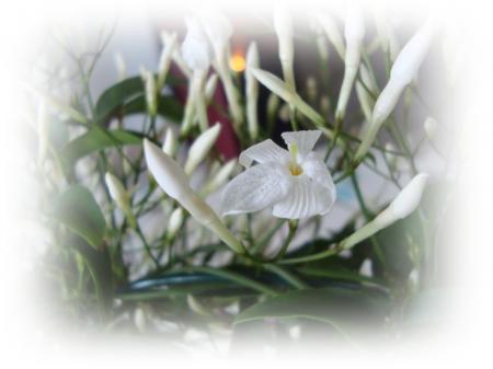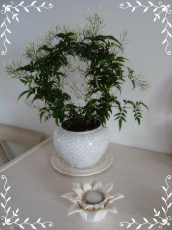 Roger m'a offert un jasmin blanc (Jasminum Polyanthum). Pour le moment, il est encore en boutons mais depuis aujourd'hui, les fleurs commencent à s'ouvrir. C'est magnifique comme fleur et ça sent très bon!