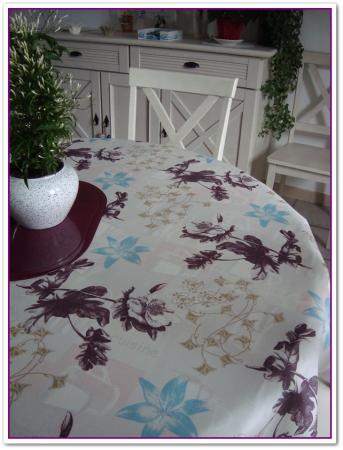 J'en profite pour vous montrer ma nouvelle nappe. Elle est en coton enduit. Cette matière est bien pratique pour le nettoyage car à présent, nous prenons nos repas à la salle-à-manger. Ainsi, nous en profitons...