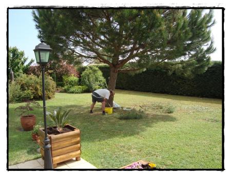 Mais qu'est-ce qu'il bricole encore, Roger? Il est en train de couper les branches basses du pin. Mais pourquoi?