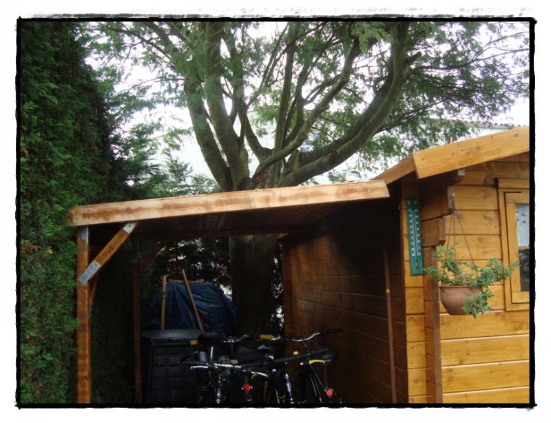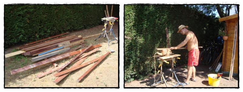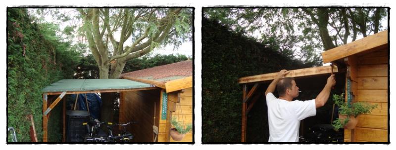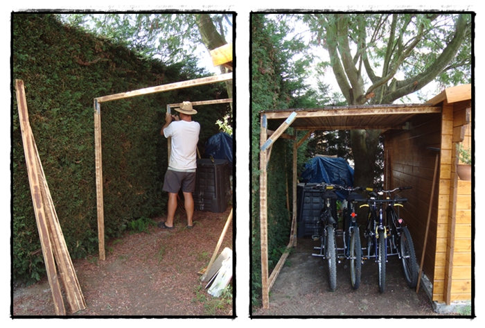 Il les a poncées et le voilà en train de construire un auvent accolé au chalet pour stocker les vélos.