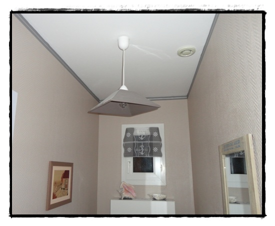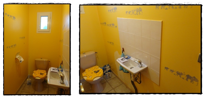 Les toilettes, c'est comme le couloir.... vous allez voir le changement.... A l'origine, les murs étaient peints en jaune orangé et avaient été décorés par des pochoirs d'éléphants gris.....