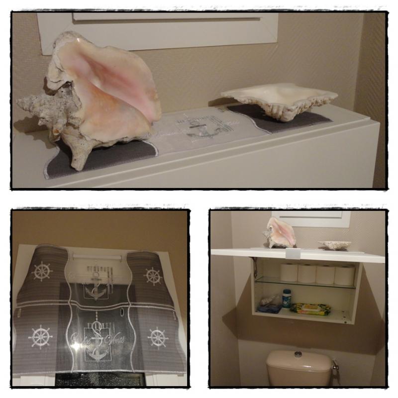 Au-dessus des toilettes, nous avons installé un petit meuble que nous avions acheté chez Ikéa. Pratique pour ranger le papier WC, les lingettes, ....