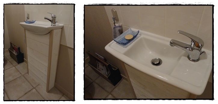 Roger a très bien fait l'habillage (amovible) du dessous du lave-main. Nous avons acheté des lames de bois assez rustiques et déjà lasurées. Les baguettes d'angle ont été peintes en beige pour rappeler la couleur de la tapisserie.