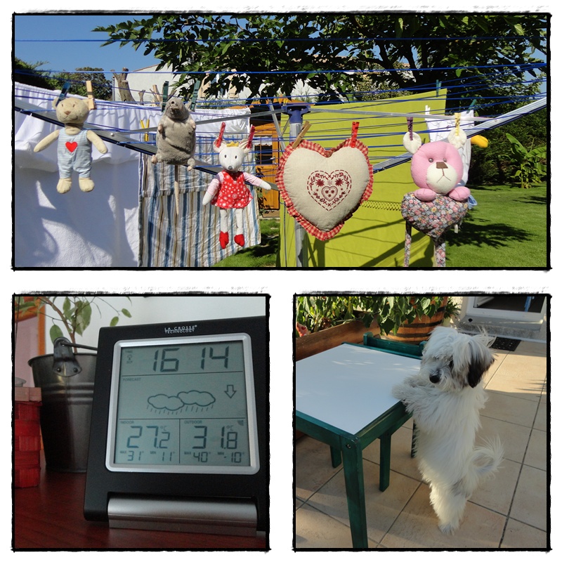 Le temps idéal pour faire tourner la machine à laver et sécher le linge. A présent, tout est lavé même les peluches avec lesquelles Lucie s'est amusée mais aussi Hinès. Il ne fallait rien laisser traîner car Hinès les emmenait immédiatement dans le gazon....