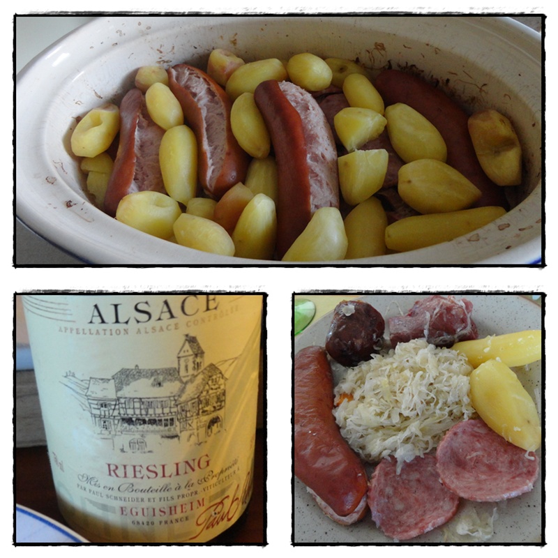 Nous avons trinqué à nos retrouvailles en dégustant un gewurztraminer vendanges tardives. Ce plateau apéritif se composait de : - un velouté de courge butternut à la poire - une terrine aux rosés des prés (excellente recette de Laurence du blog "Le Mas du Loup"). Un grand moment de convivialité autour d'une bonne choucroute! Le temps était bien frais, cette recette était de saison.... Voici la recette.