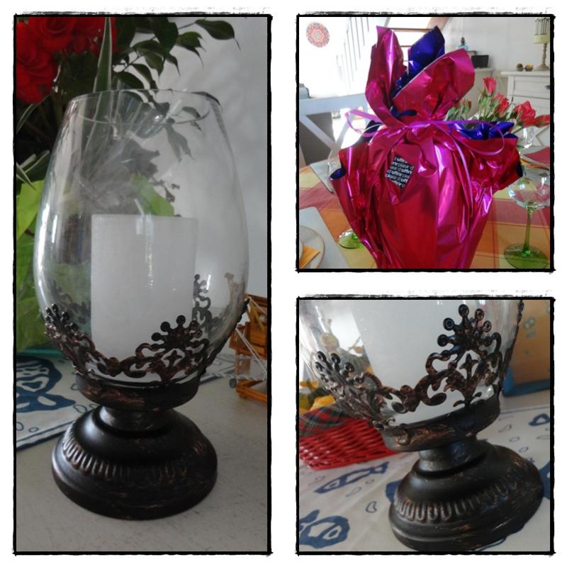 J'ai été gâtée! Annie et Jean m'ont offert ce magnifique photophore. J'aime beaucoup sa forme et son pied en métal travaillé et découpé. A présent, il trône sur ma table de salle-à-manger.