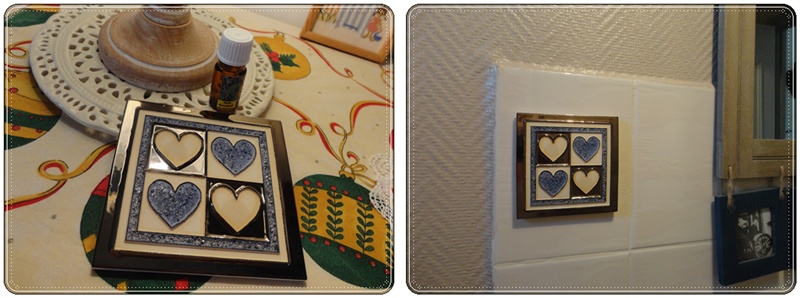 Il faut verser l'huile essentielle sur les parties non émaillées des coeurs et attendre que l'huile pénètre dans la terre cuite. Sur le carrelage mural du lave-mains des toilettes, j'ai collé la languette métal adhésive. Le diffuseur tient sur cette languette grâce à des aimants.