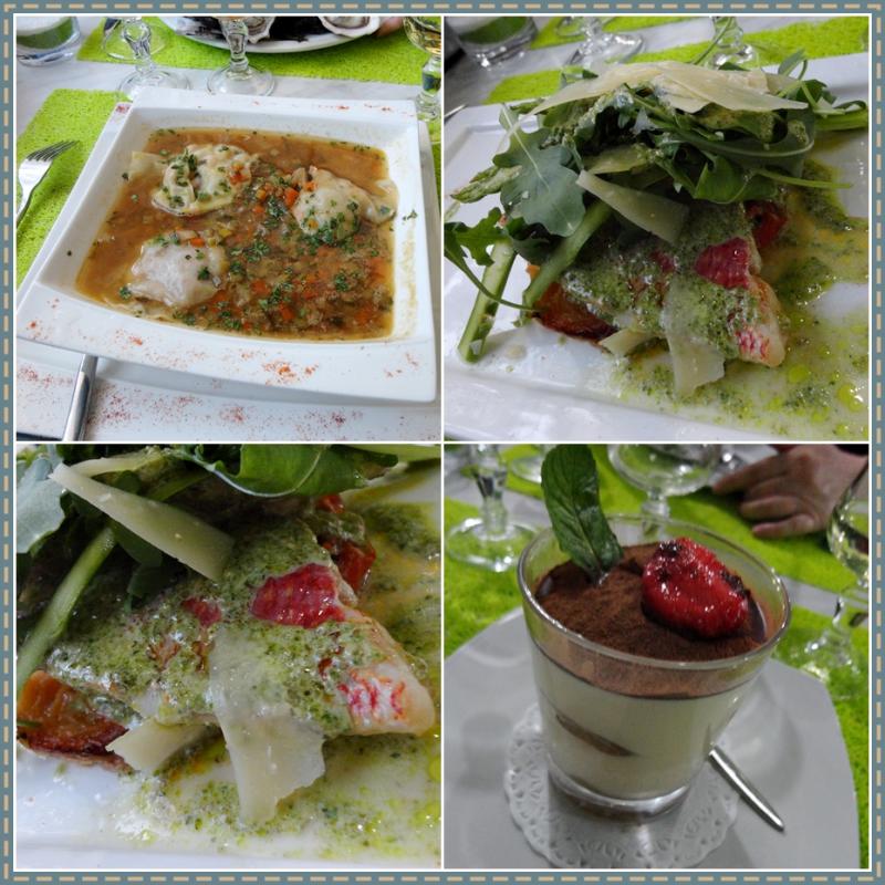 - Filets de rouget, tatin de légumes, lamelles d'asperges vertes, roquette poivrée avec lamelles de parmesan sauce pistou