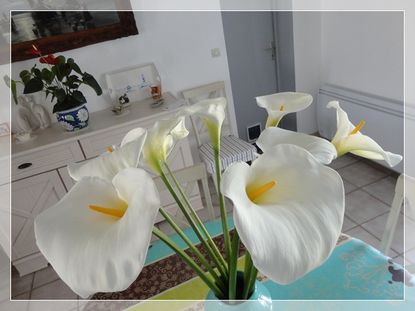 Roger m'a cueilli quelques arums de notre jardin. Ces fleurs sont de pure merveille.