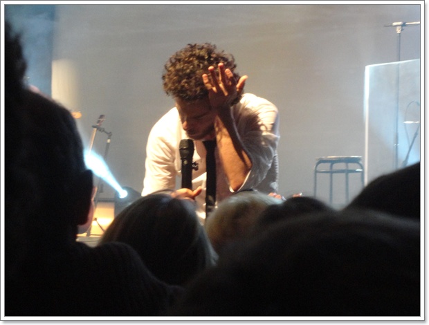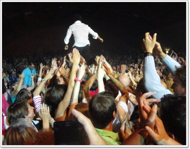 Michaël GREGORIO a plongé dans le public..... un hommage aux groupes de punk, explique-t-il.... Le public le porte jusqu'au fond de l'Espace Colette Besson.