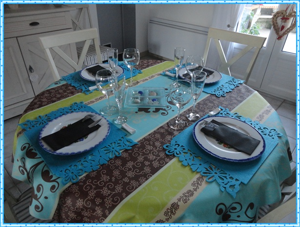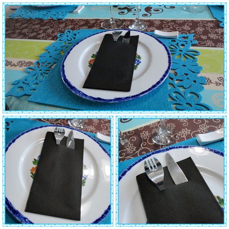 La table est mise.... Une petite nouveauté... J'ai trouvé des serviettes en papier qui font aussi pochette pour ranger les couverts. J'ai aimé cette petite fantaisie!