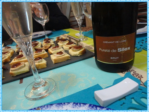 A l'apéritif, toasts briochés au foie gras et confiture de figues, le tout maison... accompagnés d'un excellent crémant de Loire. Un petit clin d'oeil à Sylvie et Marc....