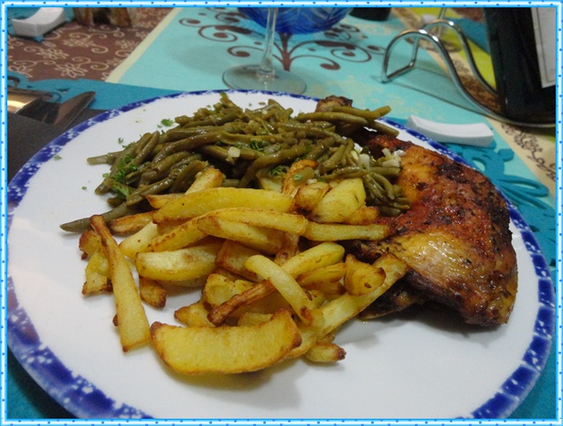 Cuisses de poulet au four aux herbes de Provence, frites maison dans l'Actifry et haricots verts (conserves maison).