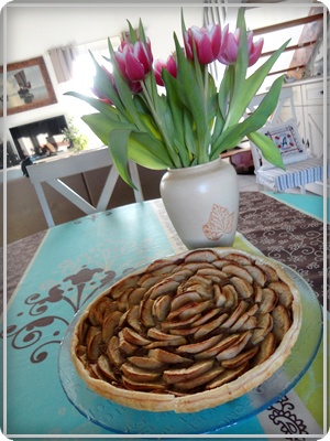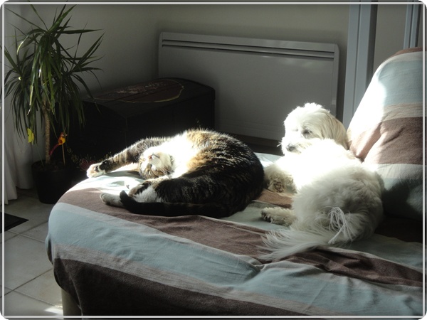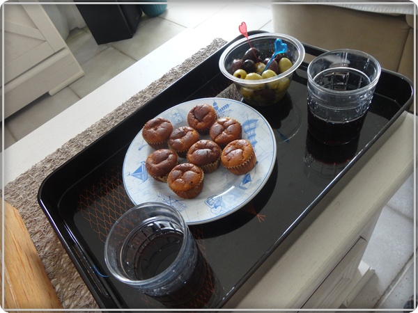 | Il faut savoir prendre le temps.... Bien installés au salon, nous dégustons un vin de cerises maison (la recette est ICI) accompagné de petits cakes au chèvre et d'olives à la grecque.     Petit goûter avec une tarte aux pommes et aux speculoos.... ...pendant que Pirate et Hinès se "dorent la pillule" au soleil....