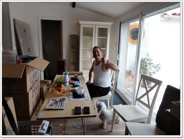 Mais Roger n'est jamais à court d'idées, il est allé chercher la table à tapisser et nous voilà opérationnels pour prendre des forces pour la journée. Il en faut car les cartons ne manquent pas....