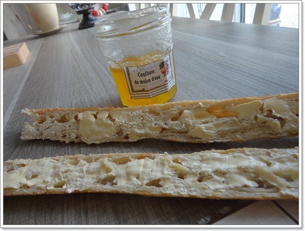 On a vite pris de nouvelles habitudes : des "croquinettes" (longues ficelles) beurrées avec de la confiture de melon d'eau maison.