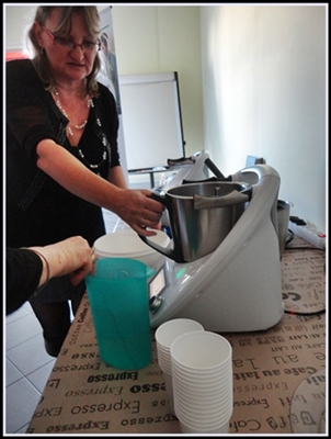 Le TM5 présente les mêmes 12 fonctions et les mêmes accessoires que le TM31. Quelques améliorations ont été apportées au gobelet, le bol est plus grand (2,2l) ainsi que le Varoma (3,3l), le fouet. Un réglage plus précis de la température est désormais possible de 5° en 5° de 37° à 120°. Il est plus puissant (10700 tours/minute). Il offre une meilleure stabilité et la balance est plus précise. Mais la grande nouveauté, c'est son écran tactile sur lequel vous pouvez suivre les recettes! On connecte une clé recettes (genre clé USB). On choisit sa recette et on la suit étape par étape sur l'écran. Vous pouvez bien sûr l'utiliser en mode manuel sans cette clé! Voilà, je vous laisse contacter une conseillère si vous voulez plus d'informations car je n'ai fait que survoler les nouveautés. Vous pouvez aussi consulter le site en cliquant sur ce LIEN. Magaly a fait une démo et nous a préparé une limonade au gingembre (Ginger Beer). C'était délicieux!