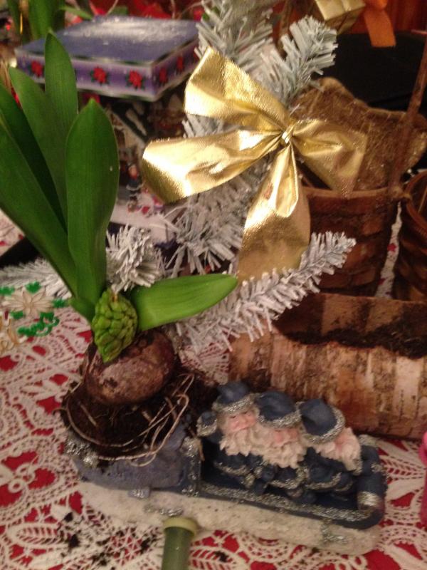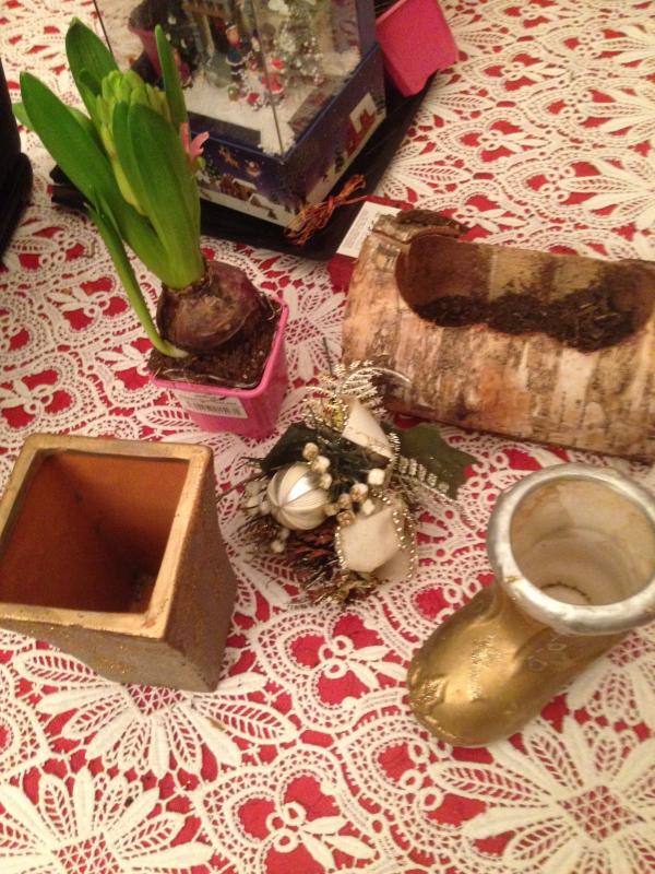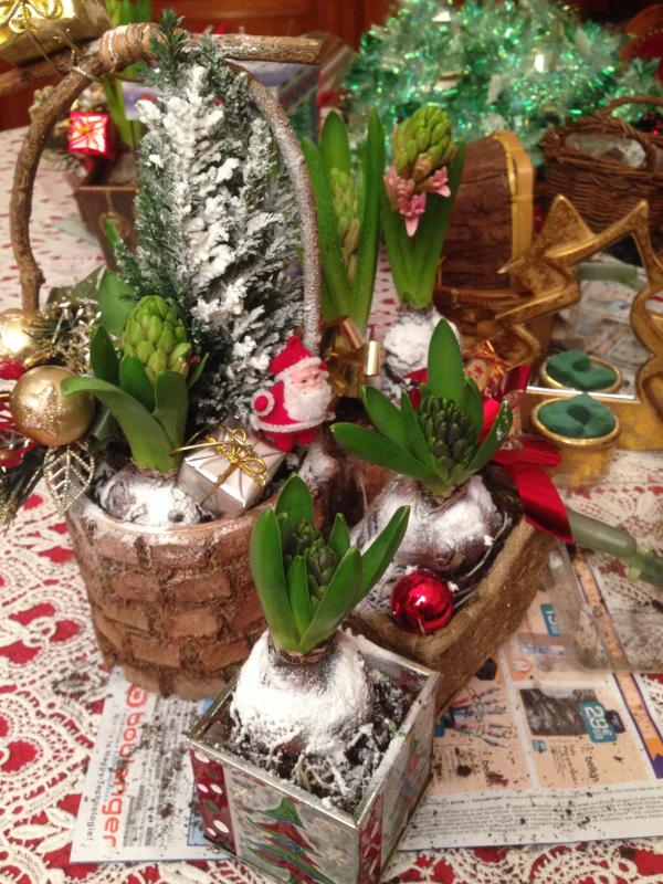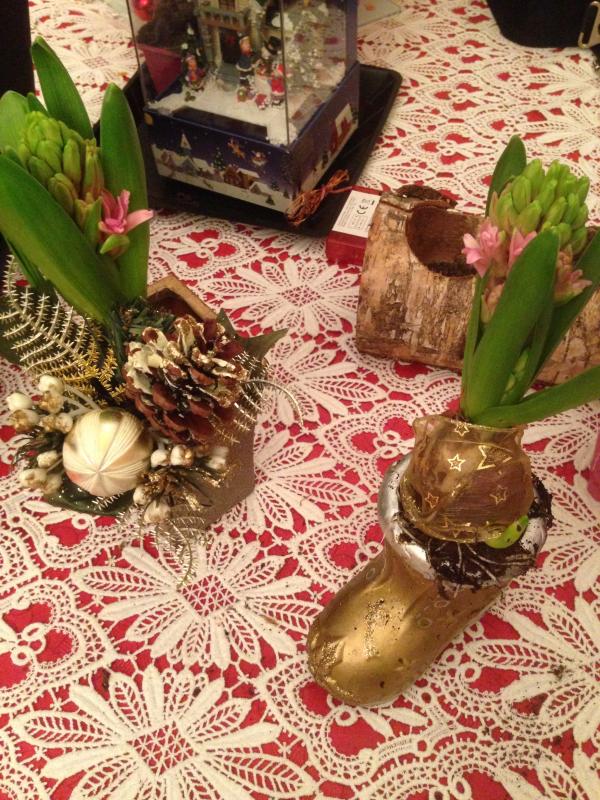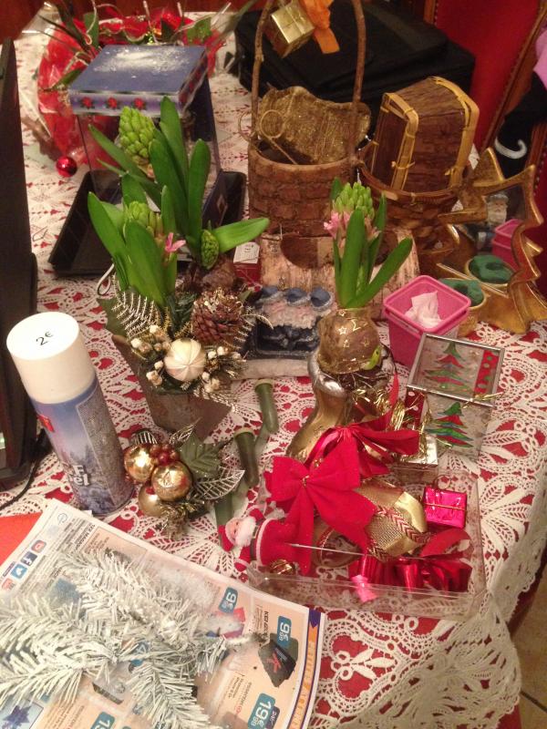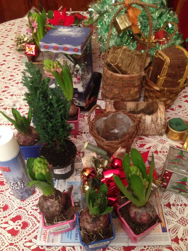 En achetant des Jacinthes ( 1 euro pièce- Si 3 achetées 1 gratuite)- On prépare des compositions suivant nos envies... Cela sent bon.....Maman sort tout et on choisit... Papa quant à lui commence tout juste les illuminations ext.( Guirlandes à positionner sur le balcon)...