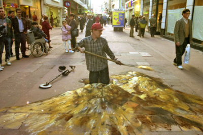 Julian Beever est un artiste britannique vivant en Angleterre. Il est surtout connu pour ses trompe-l'œil au pastel réalisés sur des trottoirs en France, Angleterre, Écosse, Belgique, Pays-Bas, États-Unis, Canada et Australie.Il crée ces oeuvres depuis 10 ans. Ces œuvres, lorsqu'on les regarde sous un angle précis, donnent l'illusion d'être en trois dimensions et de sortir du sol. Elles sont peintes au moyen d'une technique de projection appelée anamorphose et paraissent défier les lois de la perspective. Une anamorphose est une déformation réversible d'une image à l'aide d'un système optique - tel un miroir courbe - ou un procédé mathématique. L'anamorphose désigne également la déformation de l'image d'un film ou d'une émission de télévision à l'aide d'un système optique ou électronique afin de l'adapter à un écran informatique ou de télévision (Format large anamorphosé, 4/3 ou 16/9).