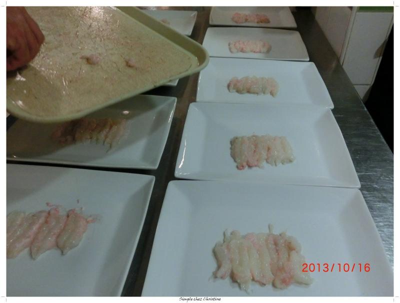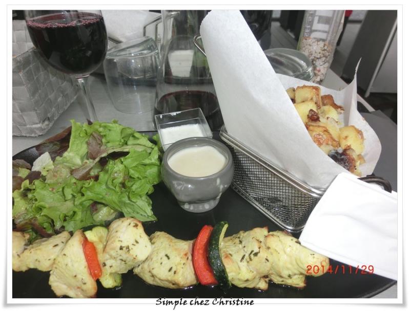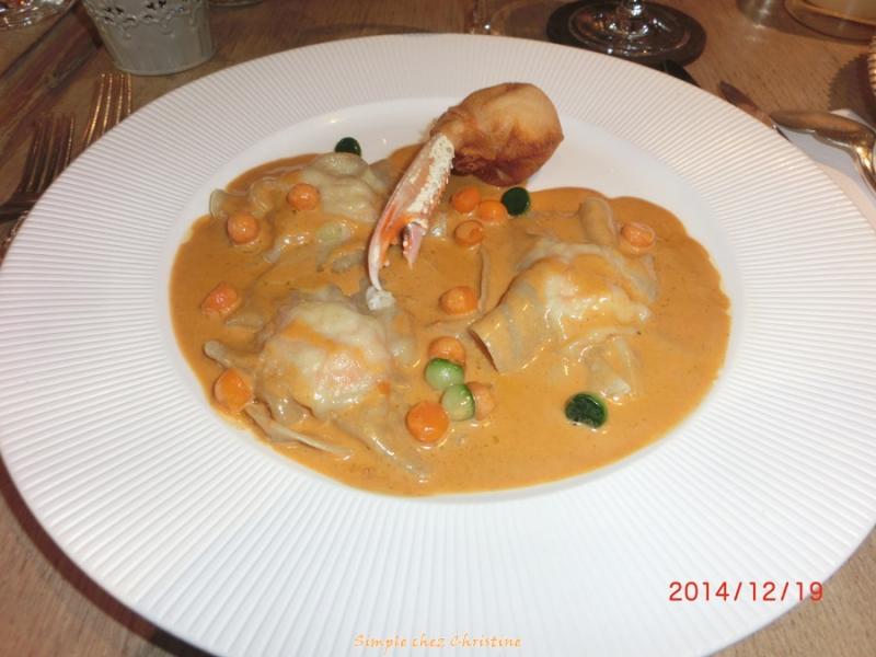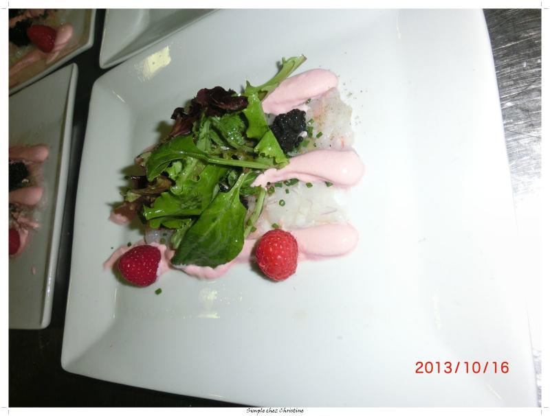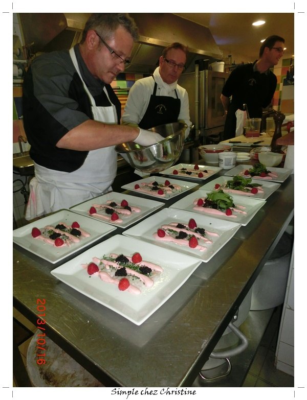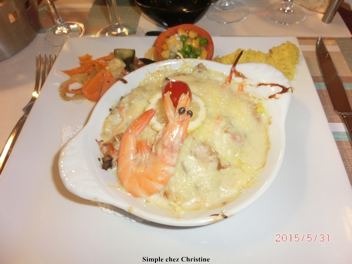 Nous nous sommes régalés entrée soupe de melon, j'abrège les noms je ne m'en souviens plus brochettes de gambas aux herbes et son risotto...