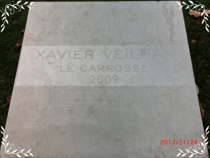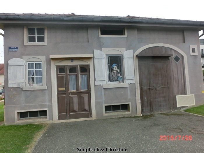 En venant de Thionville, à l’entrée de la ville, cette petite maison posée sur son terre-plein de gazon attire le regard. Chacune des quatre faces porte une peinture murale, symbole de l’histoire et du passé de la ville. Elles racontent les ateliers SNCF du début du XXème siècle, fierté industrielle de la ville. La brasserie Saint-Nicolas, fermée en 1986, démontée pièce par pièce et remontée en Chine. Les 4 vases celtes trouvés en 1927 par des ouvriers, refusés par le musée de Metz, puis par celui du Louvre, bradés 200 francs, ils sont maintenant au British Museum de Londres et valent plus d’un million d’euros. Enfin un trompe-l’œil montre un homme à sa fenêtre. Les vraies ouvertures sont masquées par la peinture. Voilà les 4 façades passage par mon jardin, un potiron !!