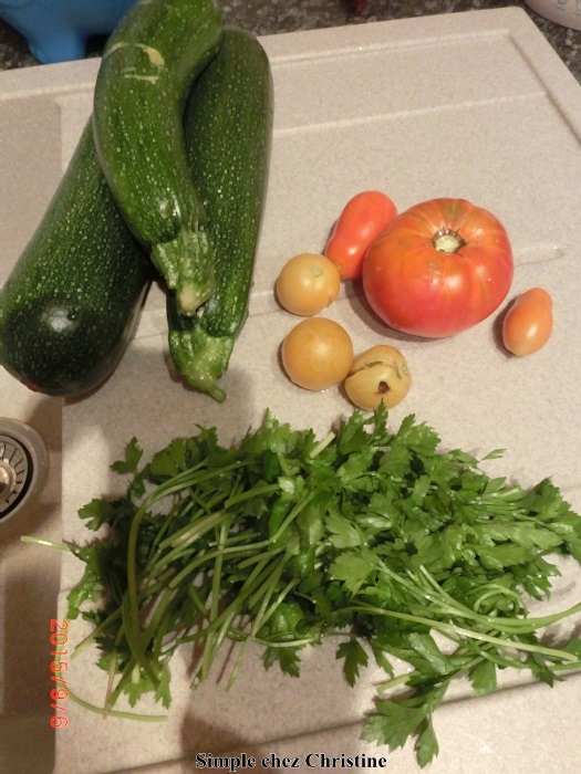 une petite récolte, courgettes, tomates rouges, jaunes, persil.