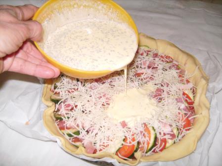 ingrédients 1pâte brisée 2oeufs 2-3 cougettes 3-4 tomates 1 sachets de lardons nature du gruyére rapé de la creme fraîche des herbes de provence sel, poivre préchauffer le four à 200°(th 6/7) laver et couper en rondelles les tomates et les courgettes mettre la pâte brisée dans un moule à tarte ,beurré Y installer les tomates et les courgettes coupées en rondelles à votre convenance saler, poivrer
