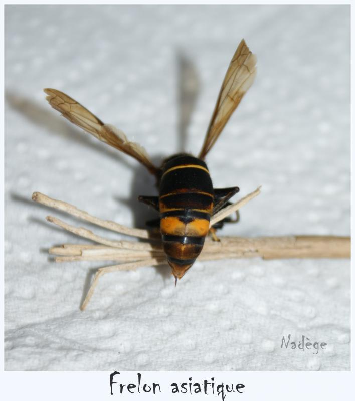 Les frelons asiatiques mangent les abeilles et mettent en danger nos ruches ... Nous en sommes envahis depuis 2004 en Loir et cher . A ce jour, il y en a encore qui viennent ce nourrir sur mes lierres près de ma cuisine !! je dois être très vigilente. Il n' y a pas d' essaim chez moi ; mais il est peut - être dans le village. |
