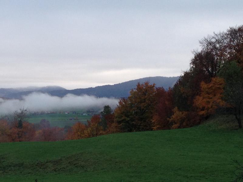 Nous n'avons franchi qu'un kilomètre... et le changement d'horizon est total ! Voici ce que nous voyons depuis la terrasse.....le soir, vers 18h. deux renards viennent manger les cerises tombées d'un arbre, juste en face !