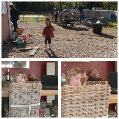 puis nous y sommes retourné la semaine suivante pour terminer les travaux : tendre les fils, poser le grillage - heureusement il faisait une journée estivale et j ai pu garder la petite Mila en jouant dans le jardin - ma fille a même dû passer de la crème dans le dos de son mari et de son père tant le soleil "tapait" -