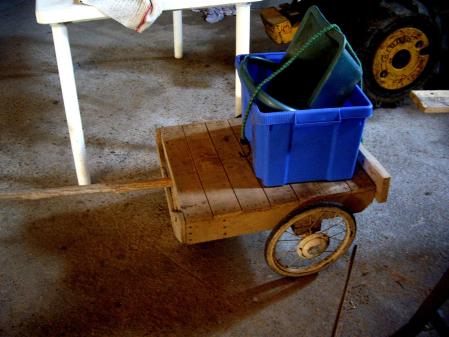 dans un coin sa nouvelle brouette - l autre ayant rendu l âme avec des roues de berceau et quelques planches voici une "brouette maison" avec laquelle il va dans le fossé derrière la maison récuper de la bonne terre pour améliorer son jardin