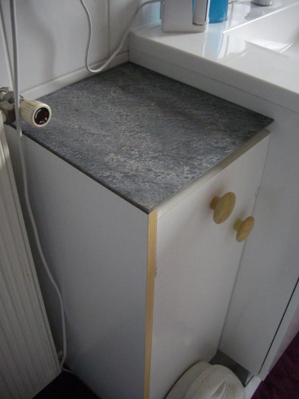 et toujours avec l ancienne armoire qu il a retaillé en largeur et en hauteur bien sûr - voilà en rajoutant des pieds pour harmoniser l ensemble il m a confectionné ce petit meuble qui me sert de rangement pour les produits d entretien sdb et les réserves........