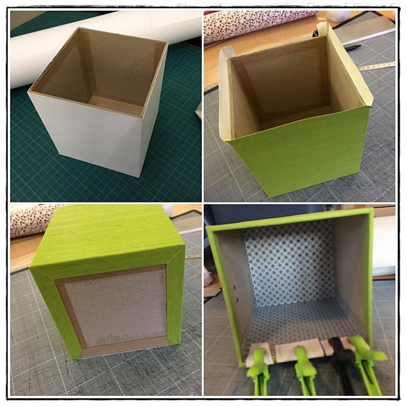 27 - Coller le fond sur la boite. Bien laisser sécher. Remborder sur les côtés de la boîte.