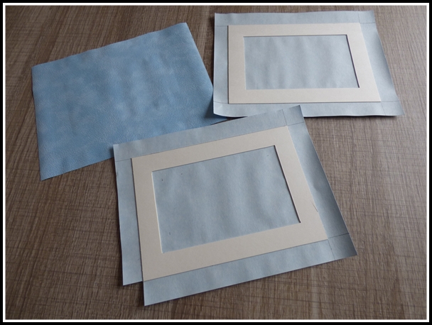 - Découper 3 bandes de cartonnette de 0,6 mm de largeur (2 de 17,5 cm et une de 12,5cm de longueur). - Au bord du carton bois, coller ces bandes sur les 2 longueurs et une seule largeur. Ceci pour permettre de créer un espace qui servira plus tard à glisser les photos. - Dans le papier bleu effet marbré, couper 3 morceaux de 13cm sur 18,5cm.