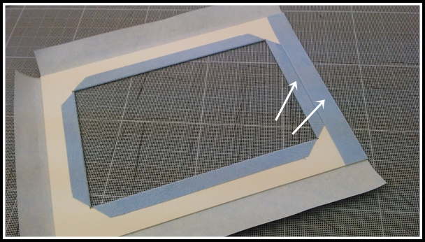 16 - Terminons d'habiller le cadre. Découper dans le skivertex blanc une bande de 30cm sur 14,2cm et la coller sur le devant. Au centre de cette bande, tracer un carré de 3cm de côté et l'évider. 17 - A partir de chaque coin du carré, couper avec le cutter vers chaque coin du cadre. Rabattre en veillant à très bien épouser la forme des rebords. Vous aider de votre plioir. Coller les 4 parties sur l'envers du cadre.