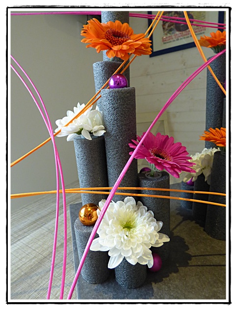 Et c'est là que nous sommes tombées sous le charme du stand de Pétal'IN, diplomée d'Art Floral artistique par la société d'horticulture de France et l'école des fleuristes de Paris. Elle nous a expliqué qu'elle organisait des cours "découverte" et que la prochaine session était le samedi 13 décembre 2014. Evelyne et moi, nous nous sommes inscrites et voilà notre premier cours. Le thème était la réalisation d'un centre de table pour les fêtes.