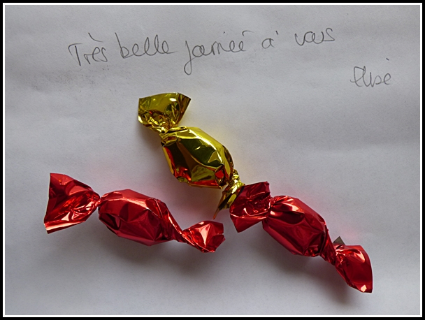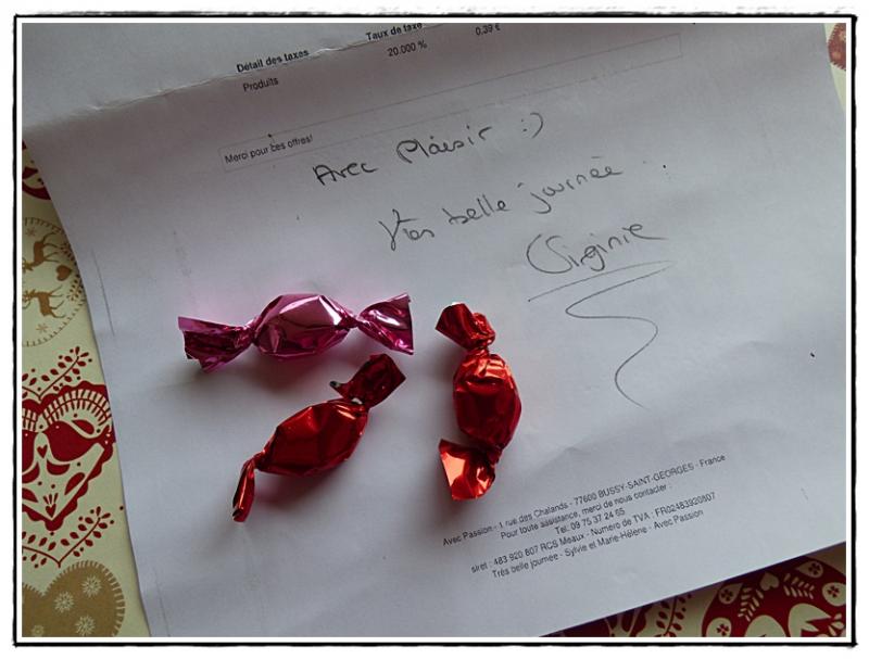 J'ai reçu mon colis samedi matin et oh! surprise.... un petit mot très gentil était écrit sur la facture et ..... 3 bonbons accompagnaient le tout!!!! C'est rare... mais ça fait plaisir! |