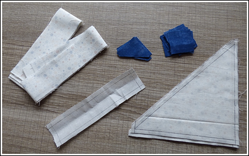 7 - Dans le papier bleu marine, découper 2 morceaux de la même taille que les trapèzes sans oublier d'ajouter 1,5cm tout autour pour remborder. Ces papiers serviront à recouvrir plus tard ces 2 trapèzes.