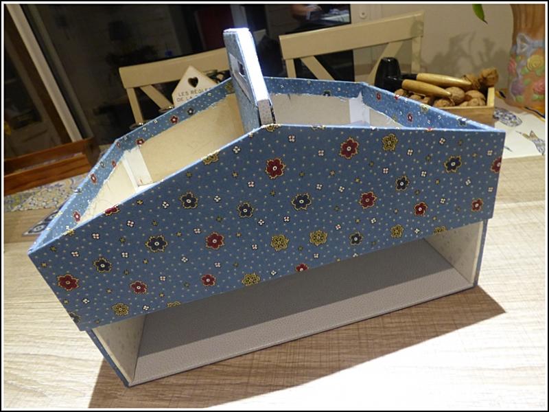 12 - Ajuster le carton A qui va fermer le fond. L'habiller de papier bleu coupé au ras de chaque côté.