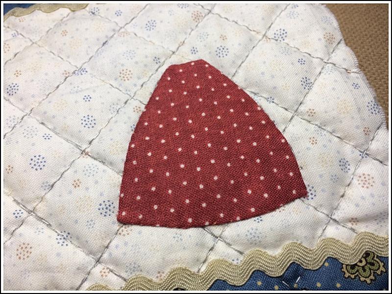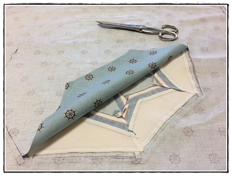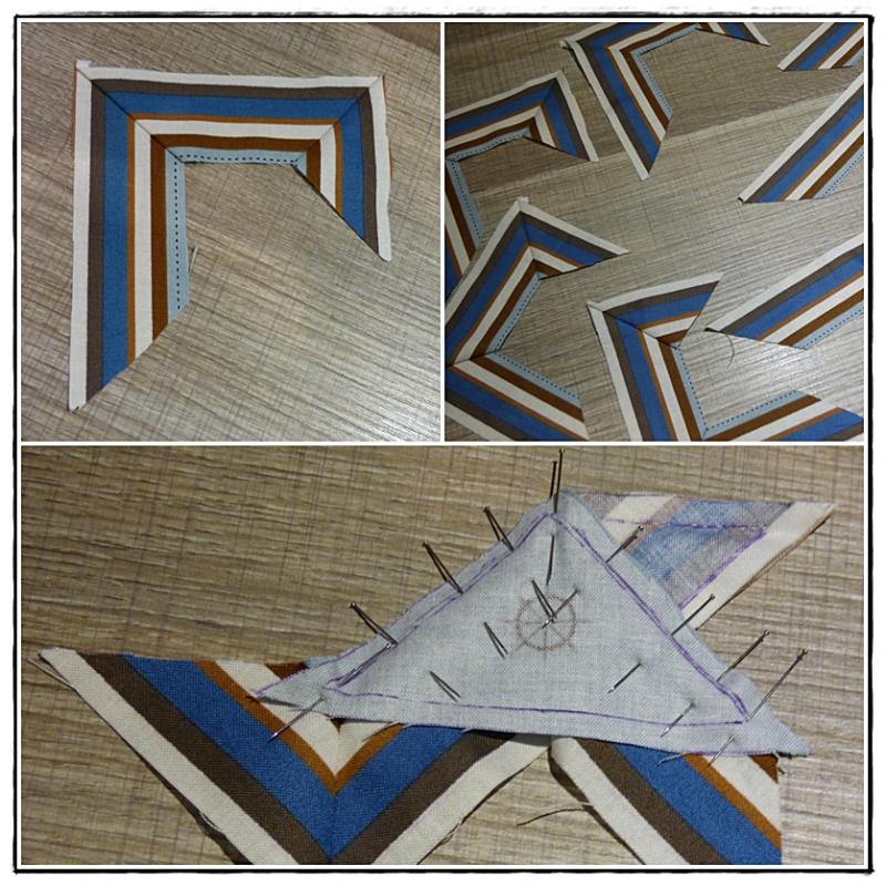 18 - A présent, nous allons remborder toues les bandes bleues et blanches sur l'envers du cadre. Commençons par les 4 coins.