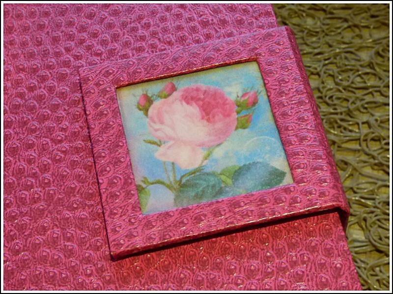 Sur le dessus du couvercle, j'ai fait de l'embossage. Je vous parlerai dans un nouvel article de cette technique qui me plait beaucoup et qui permet de personnaliser notre réalisation.