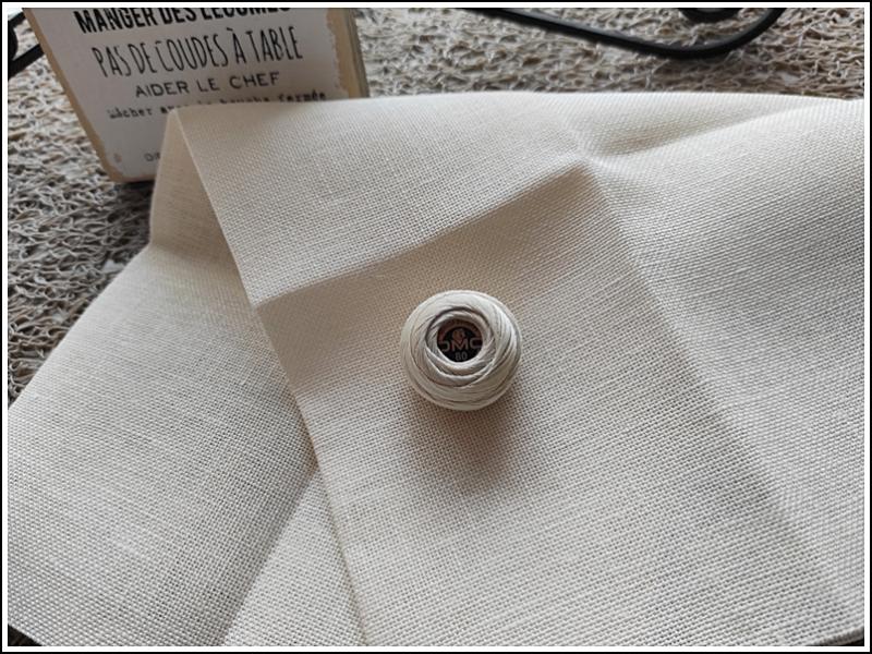 Le kit m'a été livré avec un fil DMC dentelle écru mais j'avais envie de plutôt broder avec un fil de couleur bleue. Comme je n'ai pas trouvé de fil DMC dentelle bleu dans les merceries royannaises, j'ai utilisé mon fil à quilter qui va bien aussi car il est résistant. C'est ce qu'il faut absolument car il faut tirer sur le fil pour réaliser ces jours entre les fils.