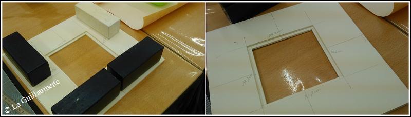1 - Dans le carton 3mm, couper 2 cartons de 26cm sur 26cm. Sur le premier carton, ouvrir une fenêtre dans le milieu de 12,2cm sur 12,2cm. Sur le deuxième carton, ouvrir une fenêtre de 11cm sur 11cm. 2 - Dans le carton 2mm, couper : A : un carton de 11,5cm sur 11,5cm B : un carton de 11,5cm sur 7,5cm C : deux cartons de 11,5cm sur 12cm pour tailler les trapèzes D : un carton de 12cm sur 12 cm dans lequel on coupe un cercle de 8,7cm de diamètre. La réalisation : 1 - Coller le carton A sur le carton B. Au cours, nous disposons de poids pour aider la prise de la colle.
