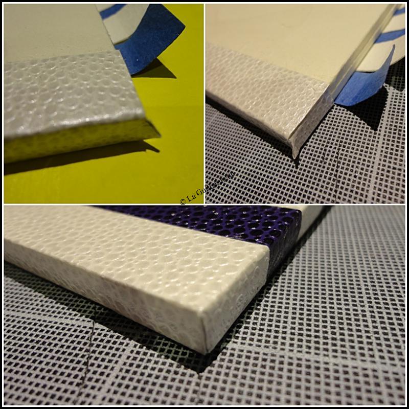 15 - Dans le skivertex blanc, découper une bande de papier de 3mm de large. Cette bande sera collée dans chaque angle intérieur de l'ouverture. C'est pour que les angles soient bien habillés (voir photo).
