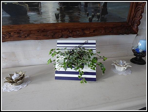 ================================================================= Mes cadres à chapelets étant terminés, je peux attaquer une nouvelle réalisation au cours de cartonnage. Dominique, notre formatrice, nous a proposé de faire un cadre végétal. C'est un support en carton habillé pour une plante. Un joli cadeau à l'approche des fêtes! Le matériel : - du carton bois 3mm - du carton bois 2mm - du skivertex bleu marine - du skivertex blanc nacré - 1 petit seau en zinc de 8 à 9cm de diamètre - 1 petite plante - colle Voici le modèle....